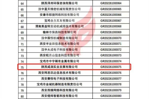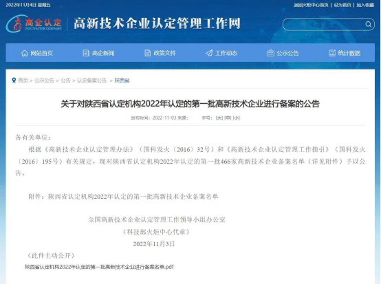 2022年11月3日,根據《高新技術企業認定管理辦法》(國科發火〔2016〕32號)和《高新技術企業認定管理工作指引》(國科發火〔2016〕195號)有關規定,全國高新技術企業認定管理工作領導小組辦公室對陜西省認定機構2022年認定的第一批高新技術企業備案名單予以公告。