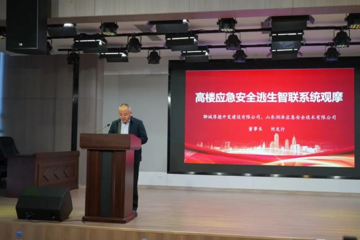 聊城厚德開發建設有限公司董事長劉龍行就本次會議致結束語。他表示高層建筑應急安全逃生一直是個大難題,聊城厚德開發建設有限公司先行先試,大膽創新,開發建設的市級重點項目--聊城應急安全科創谷,安裝“高樓應急安全逃生智聯系統”,為山東省新建項目第一。希望通過此次觀摩,打造一個幫助我們更加深入認識高層建筑安全重要性的平臺,也讓我們親眼見證“高樓應急安全逃生智聯系統”的高效便利性。