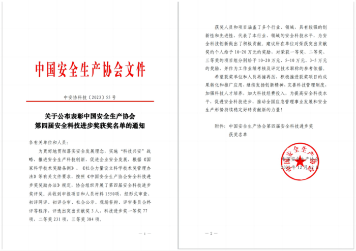 “中國安全生產協會第四屆安全科技進步獎”!