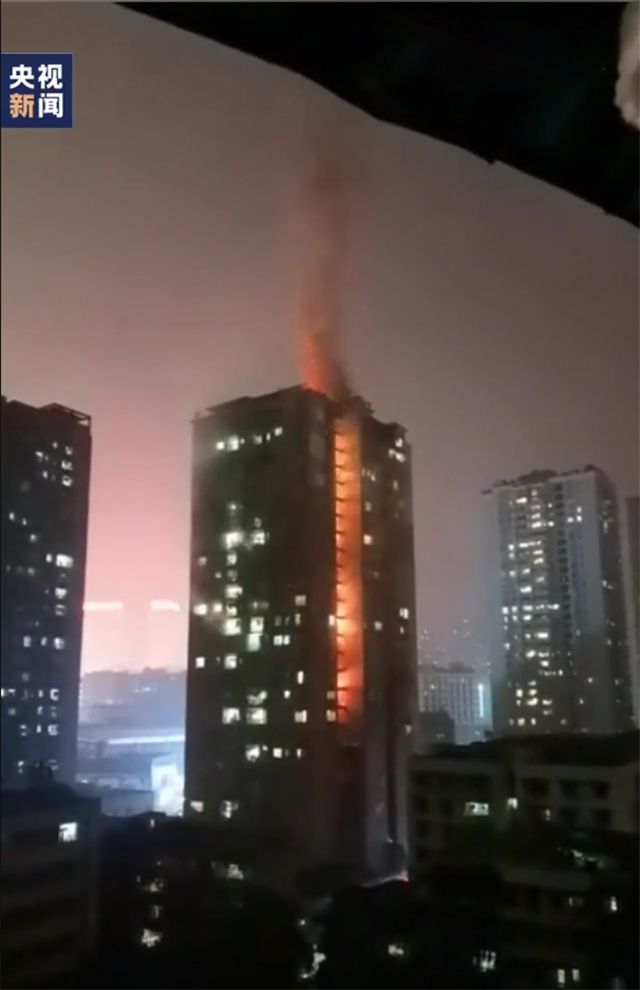 現場畫面顯示,火勢異常兇猛,明火很快貫穿著火點以上樓層,高樓瞬間變成了一個“煙囪”,不斷還有小火星從頂樓往下掉,看起來觸目驚心。初步了解,起火原因是中間樓層的雨棚著火引發火災,具體情況正在進一步的調查中。