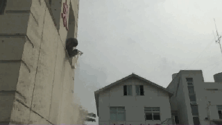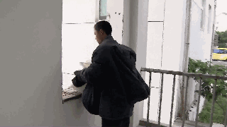 消防員爬上將近3米高的窗戶邊,從上往下撒玉米粉,我們可以看到,玉米粉一接觸到明火,火舌就不斷往上躥。